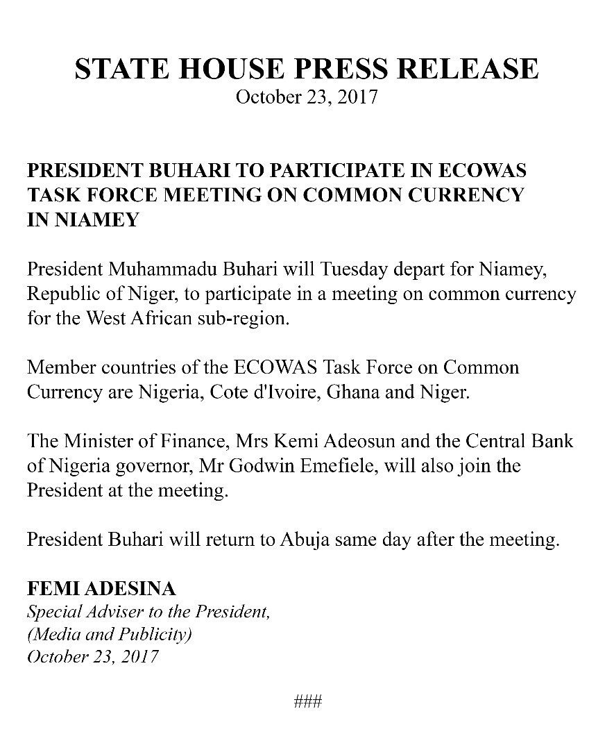 Today President Buhari travels to Niamey, Niger, for ECOWAS Task Force Meeting on Common Currency. Accompanied by Minister of Finance & Governor of Central Bank of Nigeria